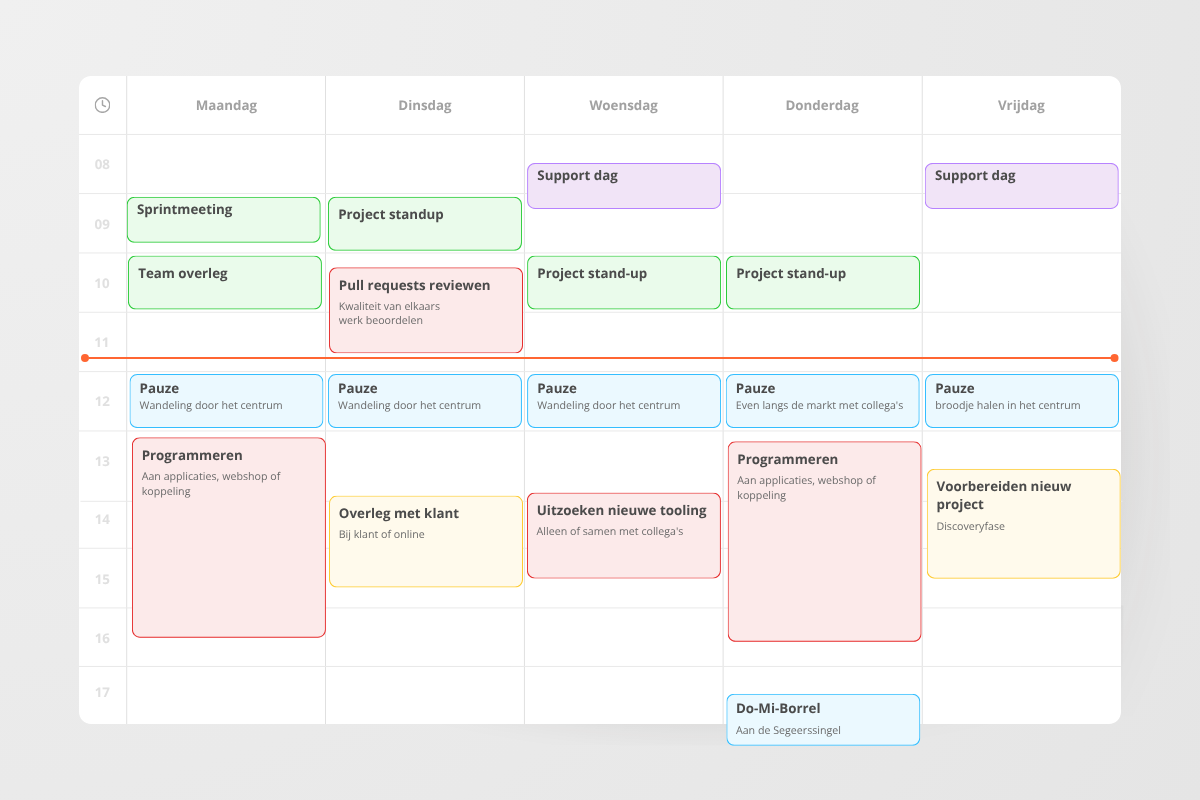Dit is een fictief voorbeeld van hoe jouw werkweek eruit kan zien, zodat je een goed beeld krijgt van wat je gaat doen.